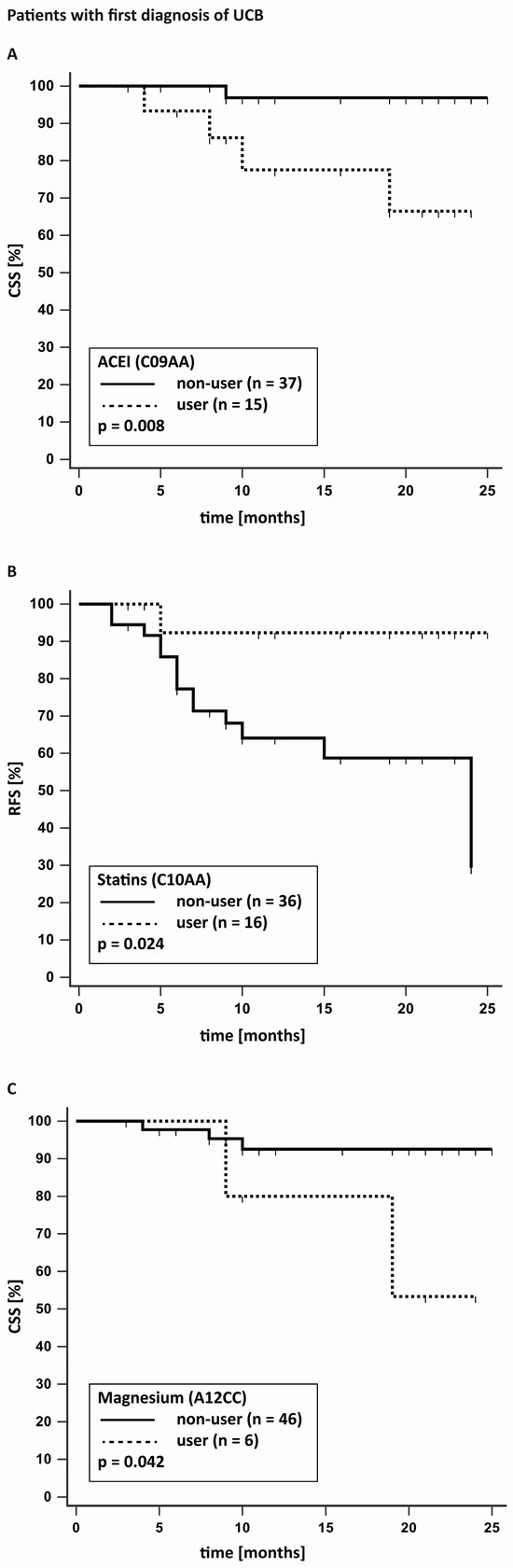 Kaplan–Meier curves for patients with a first diagnosis of urinary bladder cancer (UCB) with and without angiotensin-converting enzyme inhibitors (ACEI) (A) or magnesium (C) on cancer-specific survival (CSS) and statins (B) on recurrence-free survival (RFS).