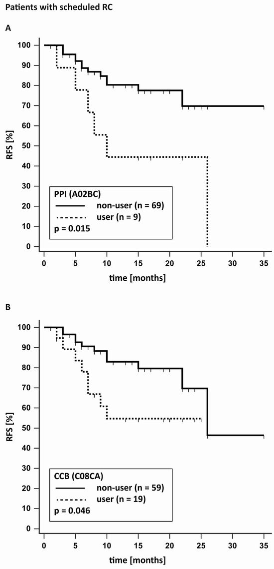 Kaplan–Meier curves for patients with scheduled radical cystectomy (RC) with and without proton-pump inhibitors (PPI) (A) or calcium-channel blockers (CCB) (B) for recurrence-free survival (RFS).