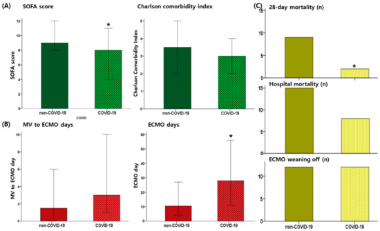 Comparison of patients’ characteristics classified by the diagnosis of COVID-19 as the cause of acute respiratory distress syndrome. (A) Sequential organ failure assessment score and Charlson comorbidity index; (B) treatment course explained with the time period of the initiation of mechanical ventilation to extracorporeal membrane oxygenation (ECMO) and duration of ECMO support (days); (C) outcomes of patients, 28-day mortality, hospital mortality, and the number of patients successfully weaned off ECMO. *, p < 0.05 when compared between non-COVID-19 patients and COVID-19 patients. Non-COVID-19 patients were indicated with dotted bar and COVID-19 patients were indicated with solid bar in the graphs.
