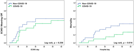 In patients with COVID-19 with a longer duration of ECMO support, the 28-day mortality was lower than that noted in non-COVID-19 patients (9/24 [37.5%] versus 2/21 [9.5%], p = 0.040); however, 11 patients among 19 (57.8%) 28-day survivors were supported by ECMO for longer than 28 days. This finding was reflected in Kaplan-Meier curves as a lower ECMO weaning off rate of COVID-19 patients, despite the lack of statistical significance (p = 0.258), and lower mortality (p = 0.016) simultaneously (Figure 2).