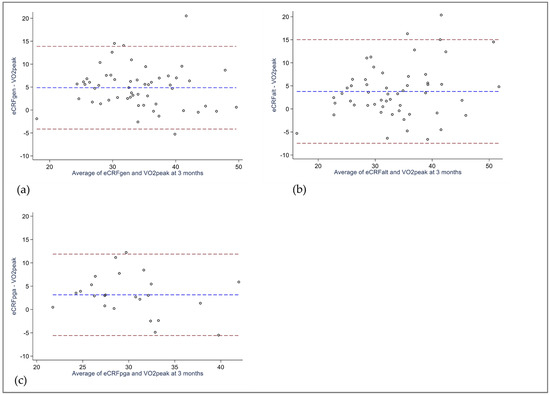 eCRFALT [23] eCRFPGA [23] | (female = 0, male = 1; never smoked = 0, ever smoked = 1) 77.851 + (gender × 25.460) − (age × 0.381) − (age–gender interaction × 0.254) − (BMI × 0.743) − (resting heart rate × 0.115) − (smoking × 2.154) + (physical activity index × 0.209) 77.961 + (gender × 28.791) − (age × 0.358) − (age–gender interaction × 0.326) − (BMI × 0.700) − (resting heart rate × 0.125) − (smoking × 1.854) + (physical activity index × 0.211) − (PGA × 0.071) |