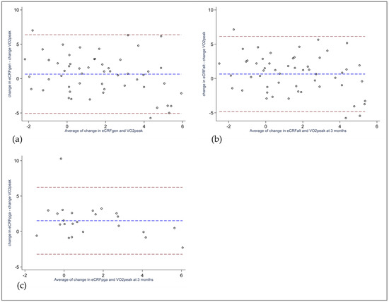 | eCRFPGA, mL/kg/min ICC (95% CI) Linear regression, regression coefficient, (95% CI) R2 Difference eCRFPGA—VO2peak, mL/kg/min, (95% CI) 95% Limits of agreement | 29.6 (4.6) 0.62 (0.30 to 0.81) 1.6 (−0.1 to 3.4) a −6.6 to 9.8 | 31.7 (4.8) 0.57 (0.13 to 0.81) 3.1 (1.3 to 5.0) a −5.6 to 11.9 | 2.1 (1.3 to 3.0) a 0.39 (0.01 to 0.68) 0.68 (0.06 to 1.29) b 0.24 1.5 (0.5 to 2.5) a −3.2 to 6.2 |