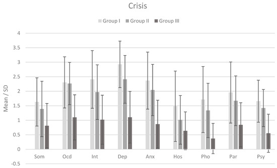 Figure 1 shows the means and standard deviations for the severity of each symptom on the SCL-90 in the three groups during the crisis (first measurement). Using one-way analysis of variance (ANOVA) and post hoc analysis, it was shown that significant differences (at p ≤ 0.05) existed between each of the clinical groups (I and II) and the control group (III), while differences between clinical groups were non-significant (except for the depression dimension, where all differences were significant).