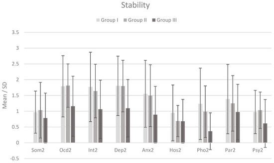For the second measurement (in stability), the results were distributed in a different way. Figure 2 shows the means and standard deviations within symptoms in each of the distinguished groups. Analyzing the differences between the means, it was found that the clinical groups did not differ in all measured symptoms. Only some of the differences between the clinical and control groups remained compared to the first measurement. The control group differed significantly from the clinical groups in obsessive–compulsive, depressive, and phobic symptoms. There were also differences between the control group and the clinical suicide group in the case of the interpersonal severity scale and anxiety scale. The other differences were not significant.