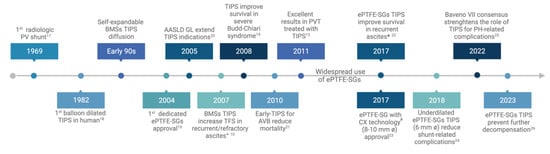 Milestones in TIPS development [,,,,,,,,,,,,]. (°) = International Ascites Club definition of recurrent and refractory ascites; (*) = recurrent ascites defined by the performance of at least two large-volume paracenteses within a minimum interval of 3 weeks. Abbreviations: AASLD, American Association for the Study of Liver Diseases; AVB, acute variceal bleeding; BMSs, bare metal stents; CX, controlled expansion; ePTFE-SGs, expanded polytetrafluoroethylene-stent grafts; GL, guidelines; PH, portal hypertension; PV, portal vein; TFS, transplant-free survival; TIPS, transjugular intrahepatic portosystemic shunt. (Created with BioRender.com).