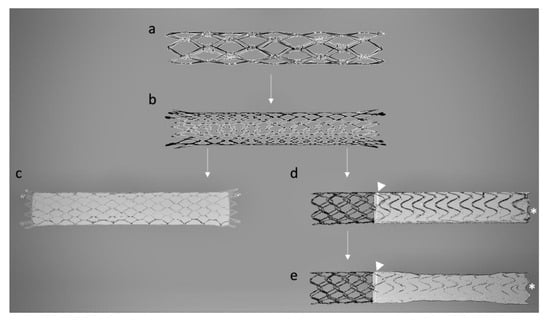 Stents used in TIPS procedures need specific mechanical properties, including high elasticity for expansion, strength to withstand liver stiffness, wear resistance, and good biocompatibility to reduce the risk of thrombosis and intimal hyperplasia, which can lead to TIPS dysfunction []. The initial generation of vascular stents primarily comprised bare metal stents (BMSs) made of biomedical metals or alloys. For instance, the Palmaz® stainless steel stent (Cordis, Miami, FL, USA), renowned for its robust mechanical strength and corrosion resistance, had reduced flexibility and a potential for complications. Similarly, the nickel–cobalt—titanium–steel alloy employed in the Wallstent® (Boston Scientific, Marlborough, MA, USA) (Figure 2b) and the nickel–titanium (nitinol) alloy used in the Luminexx® (Bard Inc., New Providence, NJ, USA), Zilver® (Cook Medical, Bloomington, IN, USA), and Smart Control® (Cordis, Miami, FL, USA) stents displayed commendable biocompatibility and corrosion resistance. Notably, they possessed unique shape memory properties and elasticity, enabling self-expansion. Nitinol stents, in particular, could undergo significant deformation and return to their original shape or nominal diameter. This innovation marked a significant milestone and facilitated the widespread adoption of the TIPS procedure [].