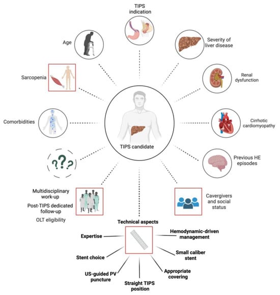 Determinants of TIPS outcomes. Closed circle = intrinsic factors; dashed circle = unknown factors; red squared = extrinsic factors. Abbreviations: HE, hepatic encephalopathy; OLT, orthotopic liver transplantation; PV, portal vein; TIPS, transjugular intrahepatic portosystemic shunt; US, ultrasound. (Created with BioRender.com).