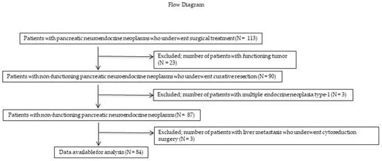 Flow diagram of the patient enrollment process. Of the 113 patients, 23 (20%) and 3 (3%) with functional PNENs and multiple endocrine neoplasia, respectively, were excluded. Three (3%) patients who underwent reduction surgery for liver metastases were also excluded. Ultimately, only 84 patients with NF-PNENs after curative surgery were eligible for inclusion in this study. PNEN, pancreatic neuroendocrine neoplasm; NF-PNEN, nonfunctioning pancreatic neuroendocrine neoplasm.