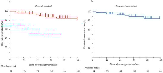 (a) OS of eligible patients (n = 84). The 5-year OS was 90.7%. (b) The DFS of eligible patients (n = 84). The 5-year DFS was 86.8%. DFS, disease-free survival; OS, overall survival.