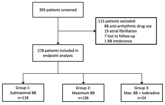 Of the 393 patients screened, 88 patients were excluded due to intake of antiarrhythmic drugs or treatment with cardiac glycosides, 19 due to atrial fibrillation in the screening ECG, 7 were lost to follow-up, and 1 was excluded for complete BB intolerance (Figure 1). Thus, 278 patients were included in the analysis, of whom 213 (76.6%) were male. The median age was 57.0 years (interquartile range 49.0–66.1). HF was predominantly due to non-ischemic compared to ischemic origin (59.7% vs. 40.3%). Almost three-quarters of patients (73.7%) had HFrEF (LVEF < 40%), one quarter (25.1%) had HF with mildly reduced ejection fraction (HFmrEF, EF between 40% and 50%), and the majority had symptoms rated according to the New York Heart Association (NYHA) as class I-II/II (44.7%) or II-III/III (30.1%).