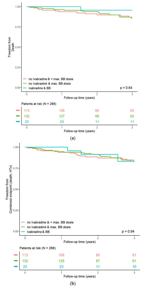 Our study cohort is comprised of ambulatory HF patients referred for advanced HF treatment options. It is characterized by a decent and widespread use of guideline-recommended HF medication including RAS-Blockers and MRA, as well as device therapy, throughout all study participants, which was a prerequisite for comparing different HR-reducing drug regimens. However, despite the good and homogeneous HF pharmacotherapy in our study and the relatively young age, the mortality rate in our study is high compared to other chronic HF studies and registries [13,14]. This may be due to a more advanced nature of ambulatory HF, owing to the setting in specialized outpatient care, which may especially apply to the “ivabradine group” with a worse LVEF and higher NT-proBNP, despite the younger age. Representing disease progression without further management options both drug-wise and device-wise, we therefore chose a composite “disease-related” endpoint of “heart transplantation or death of any cause”.
