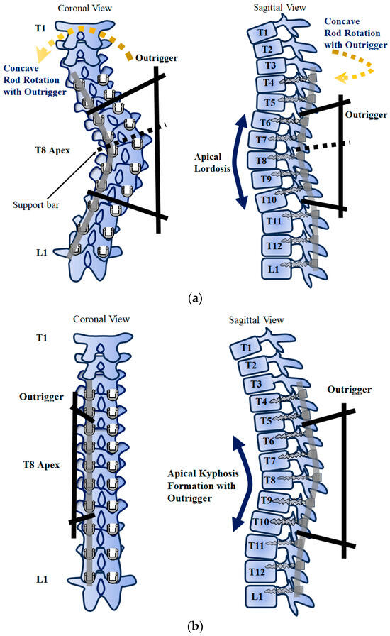 This figure shows the surgical technique with the outrigger device. The outrigger device was attached to the periapical region of the concave rod ((a) Schema of scoliosis correction method using outriggers), and then concave RR was performed to correct apical hypokyphosis and subsequently form apical kyphosis ((b) Schema of apical kyphosis formation after concave RR). The concave rod sandwiched by the outrigger devices was reinforced to prevent deformation during concave RR. After concave RR with an outrigger device was used, the setscrews sandwiched by the outrigger were tightened, and the support bar was removed. Then, DRC using a convex rod was performed while the outrigger device was attached to the concave rod.