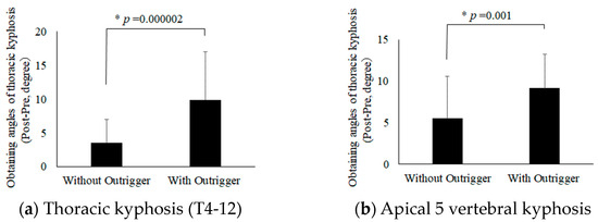 To investigate the effect of the outrigger on TK, the changes in TK and apical five vertebral kyphosis measured by X-ray before and after surgery were compared between the groups with and without outriggers (Figure 3). In measurements of the postoperative increases in TK, the outrigger group TK increased by 9.9° upon postoperative X-ray (a), while the concave RR in the group the outrigger group increased by only 3.6° (p = 0.000002). Similarly in the five apical vertebrae, kyphosis was significantly better preserved in the outrigger group (p = 0.001) (b).