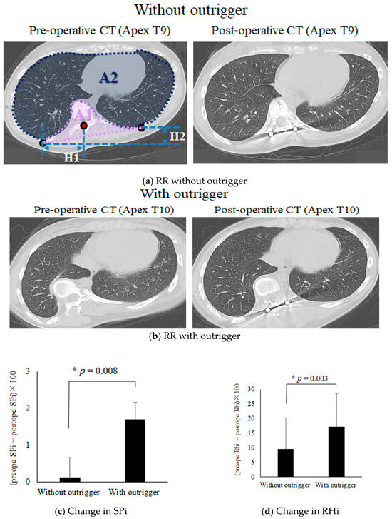 SPi and RHi analyses of RR with and without the outrigger device. SPi was calculated as A1/A2. RHi was calculated as H1/H2. Axial pre- and postoperative CT scans without (a) and with (b) the outrigger. The lung volume increased after surgery in (b). There were significant increases of in SPi (c) and RHi (d) with the outrigger group compared to those without the outrigger.