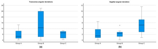 Comparison of transfer accuracy among Groups A, B, and C: (a) transverse angular deviations; (b) sagittal angular deviations. One mild outlier (°) was detected for sagittal angular deviations in Group B.