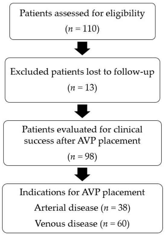 For each patient, the following were recorded: age and sex; date of the procedure; indication; arterial or venous approach; target vessel; delivery via a catheter vs. an introducer sheath; combination with other embolisation materials, with their type; AVP size and model; technical and clinical success rates; operator; coagulation disorders; complications; follow-up duration; and whether embolisation was emergent, high-priority, or scheduled.