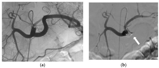 - Hoit, D.A.; Schirmer, C.M.; Malek, A.M. Use of the Amplatzer Vascular Plug as an anchoring scaffold for coil-mediated parent vessel occlusion: Technical case report. Neurosurgery 2006, 59 (Suppl. S1), ONS-E171–ONS-E172. [Google Scholar] [CrossRef] [PubMed]