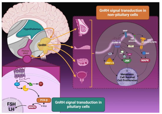 GnRH-related signal transduction in non-pituitary cells presents several differences with the one described in the pituitary gland (Figure 1), even though both mechanisms mainly involve interaction with G-proteins. In pituitary cells the signaling cascade involves the increased activation of phospholipase C (PLC, Figure 1), which degrades into inositol phosphate (IP) and diacylglycerol (DAG). In turn, IP stimulates the release of Ca2+. The increase in DAG and Ca2+ levels induces the activation of Phosphokinase C (PKC) that triggers the synthesis and pulsatile release of gonadotropins via some members of the mitogen-activated protein kinase family (MAPK) [8,10]. In non-pituitary cells, two different forms of GnRH (GnRH I and II) have been detected, which manifest different physiopathological mechanisms according to the cellular context and have a direct impact on cellular growth, differentiation, and neoplastic potential. Their effects upon binding with GnRHR are determined by a process that acts independently from PLC, while still involving MAPK cascades like (ERK), Jun N-terminal kinase (JNK), and p38 MAPK. The effects of this signaling may favor or contrast apoptosis depending on the type of tissue involved and the duration of kinase signaling. They also influence the expression of metalloproteinases (MMP), which, along with Rho-GTPases and the urokinase-type plasminogen activator (uPA) system, induce cell mobilization and development of metastasis. In extra-pituitary tissues, GnRH and GnRHR are also involved in local angiogenesis via interaction with metabolism and functionality of the vascular endothelial growth factor (VEGF) and fibroblast growth factor (FGF), as well as by taking part in a cross-talk with receptor tyrosine kinases (RTK) like EGFR and insulin-like growth factors (Figure 1) [9].