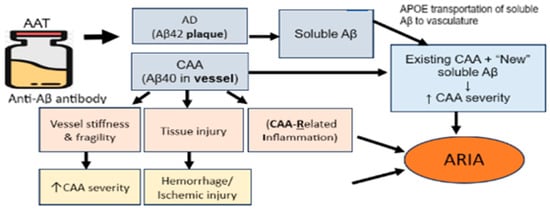 In the EMERGE and ENGAGE phase 3 randomized clinical trials of aducanumab, the incidence of ARIA-E was highest in the aducanumab 10 mg/kg group (362/1029, 35.2%) compared with the 6 mg/kg group (83/392, 21.2%), 3 mg/kg group (223/756. 29.5%), and placebo group (29/1076, 2.7%) []. ARIA has been observed most prominently in trials of antibodies that target amyloid β N-terminal compared to those that target mid-peptide and C-terminal regions of amyloid β [,,,]. For example, several clinical trials have reported an ARIA-E incidence of up to 55% in ApoE e4 (homozygous) carriers receiving the N-terminus amyloid β targeted medications [,,] compared to treatments targeting the mid-domain or C-terminus of amyloid β [,]. The N-terminus is associated with soluble forms of Aβ, which can be more readily mobilized from brain tissue to the bloodstream, potentially leading to vascular or perivascular amyloid β accumulation and edema [,,]. Despite the high incidence of ARIA, the N-terminal region targeted anti-amyloid medications have been found to be more effective in reducing amyloid β because those have the potential to clear more toxic forms of amyloid β. CAA is an important condition needing attention with the introduction of AATs for the treatment of AD. Amyloid deposition in vessel walls may lead to loss of vascular integrity and reduced perivascular clearance []. When AATs are initiated, antibody-mediated breakdown of amyloid plaque and mobilization of both vascular and parenchymal amyloid β increase the load of perivascular drainage. This overloaded perivascular pathway transiently increases amyloid deposition in the vessel walls []. At the same time, antibody-mediated inflammation and amyloid breakdown also occurs in the vessel wall, leading to further loss of vascular integrity and blood–brain barrier breakdown. As a result, proteinaceous fluid and/or red blood cells leak into the parenchyma and/or leptomeningeal space, resulting in edema/effusion (ARIA-E) or microhemorrhages/superficial siderosis (ARIA-H) []. Certain clinical and radiological features previously considered to represent AD, may in fact be manifestations of CAA; thus, future treatment of AD may be less efficacious in relieving cognitive impairment if the impact of CAA is not considered. Figure 1 below explains the underlying mechanisms of AATs, CAA, and ARIA.