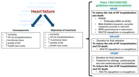 Objectives of treatment of heart failure and class I ESC guidelines recommendations. ARNI: angiotensin receptor-neprilysin inhibitor; CV: cardiovascular; ESC: European Society of Cardiology; HFmrEF: HF with mildly reduced ejection fraction; HFpEF: HF with preserved ejection fraction; HFrEF: HF with reduced ejection fraction; MRA: mineralocorticoid receptor antagonists; SGLT2i: sodium-glucose cotransporter 2 inhibitor; RAASi: renin-angiotensin system inhibitor. Figure performed with data from references [5,6,7,8,9,10,11,12,29,30].