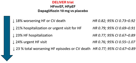 The DELIVER trial was a phase 3, randomized, clinical trial that included 6263 patients ≥ 40 years with chronic HF and a left ventricular ejection fraction > 40%, with evidence of structural heart disease and elevated natriuretic peptides, with or without type 2 diabetes mellitus. Patients were randomized to receive dapagliflozin 10 mg daily or a placebo, in addition to the standard therapy. At baseline, the mean age was 72 years, 44% were women, 75% were in NYHA functional class II, and 45% had type 2 diabetes [43].