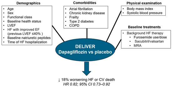 The relative benefits of dapagliflozin vs. placebo on the primary outcome in the DELIVER trial were independent of demographics, comorbidities, physical examination, and background therapies. CI: confidence interval; COPD: chronic obstructive pulmonary disease; CV: cardiovascular; HF: heart failure; LVEF: left ventricular ejection fraction; MRA: mineralocorticoid receptor antagonist; HR: Hazard Ratio. Figure performed with data from references [43,73,74,75,76,77,78,79,80,81,82,83,84,85,86,87,88,89,90].
