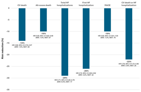 Risk reduction of events with dapagliflozin (vs placebo). Data from the pooled meta-analysis of the DAPA-HF and DELVER trials (median follow-up of 22 months). AAR: absolute risk reduction; CI: confidence interval; CV: cardiovascular; HF: heart failure; HR: Hazard Ratio; MACE: major adverse cardiovascular events (CV death, myocardial infarction, or stroke); NNT: number needed to treat over the median follow-up; RR: Rate Ratio. Figure performed with data from reference [93].