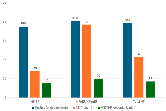 Robust evidence from clinical trials and sub-studies has demonstrated that dapagliflozin reduces not only HF (re-)hospitalizations, but also cardiovascular mortality (NNT = 68) and all-cause death (NNT = 67) in the whole spectrum of HF, without a loss of efficacy according to ejection fraction [92]. On the other hand, different studies have shown that a great proportion of patients with HF in clinical practice are eligible for dapagliflozin according to the DAPA-HF and DELIVER criteria [102,103,104,105,106,107,108]. In addition, the full implementation of dapagliflozin in real-life populations would prevent/postpone new worsening HF events or even death [102,106,107,108]. For example, a Spanish registry of 5644 patients ≥50 years old consecutively hospitalized for HF in internal medicine departments in Spain showed that full implementation of dapagliflozin would lead to robust absolute risk reductions of mortality and HF readmission, with low NNT in patients with HF, regardless ejection fraction (Figure 7) [106,107,108].