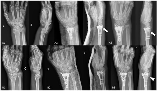 Comparison of volar locking plate fixation (VLPF) (A1–A3) with or (B1–B3) without calcium phosphate bone cement augmentation (CPBCA) in elderly distal radial fractures (DRFs). Patient A with (A1) a right DRF underwent (A2) VLPF with CPBCA (arrows) and received (A3) a radiologic follow up at 6 months post-surgically; similarly, patient B also with (B1) a right DRF underwent (B2) VLPF without CPBCA and received (B3) a radiologic follow up at 6 months post-surgically. Compared to patient A treated with VLPF with CPBCA (arrows), gradually decreased radial height, loss of volar tilting, and dorsal migration of DRF fragments (arrowhead) were noted in patient B treated with VLPF without CPBCA.