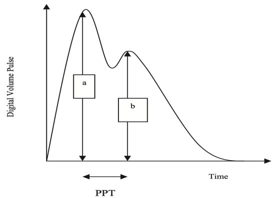 The DVP wave (Figure 1) consists of an early systolic peak (a), which results from an increase in digital blood volume from a pressure wave transmitted from the left ventricle to the finger along a direct path. The second peak, (b), occurs in diastole, and is formed by pressure waves reflected up to the aorta and thence to the finger, from sites of impedance mismatch in the lower body. The time between the systolic and diastolic peaks (peak to peak time, PPT) can be used to infer the time taken for the pressure wave to travel from the aorta to the lower body, and thence as a reflected wave back up to the aorta to the finger. This path length is unknown but is proportional to the subject’s height (h). An index of large arterial stiffness (stiffness index, SI) can therefore be derived; for instance, the calculation of pulse wave velocity (PWV) by the formula h/PPT. SI has been shown to be strongly correlated to central (aortic and carotid femoral) PWV [10].