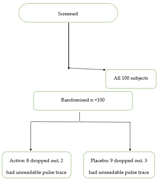 The study followed a single blind, randomized, parallel group design of two weeks of treatment with either the antioxidant formulation or placebo in a diverse group of subjects. A single blind design was used because of difficulty obtaining matching placebos and because the outcomes assessed were measured using electronic devices which avoid the possibility of observer bias. The intention was to study 100 subjects with 50 subjects randomized to each treatment arm. The exclusion criteria were the presence of atrial fibrillation or medication with antioxidant supplements. A diverse group of subjects representative of the general population was chosen so that the results would be of relevance to all groups that may choose to take antioxidant supplements. Subjects were recruited by word of mouth, from patients attending a general practice clinic, and from social groups at housing estates.