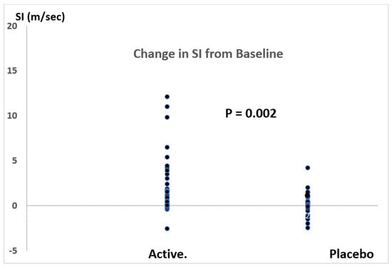 Change in SI following two weeks of antioxidant (active) therapy compared with placebo. p = 0.002 (Student’s t test).