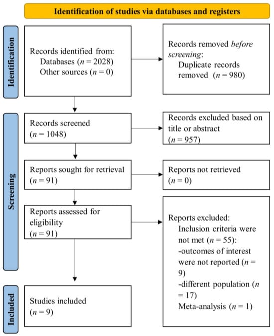 A thorough and systematic search was conducted across designated databases, yielding an initial pool of 2028 records. Subsequently, duplicate publications were eliminated, resulting in a filtered dataset comprising 464 references. These articles underwent a second assessment in line with predefined inclusion and exclusion criteria, based on a two-step approach. In the first step, two independent investigators evaluated titles and abstracts for eligibility criteria. References which fulfilled the inclusion criteria were examined in full-text in the second step. Subsequent to the full-text screening, nine studies [23,24,25,26,27,28,29,30,31] met the eligibility criteria and were included in the present analysis, as displayed in Figure 1 of the search flowchart.