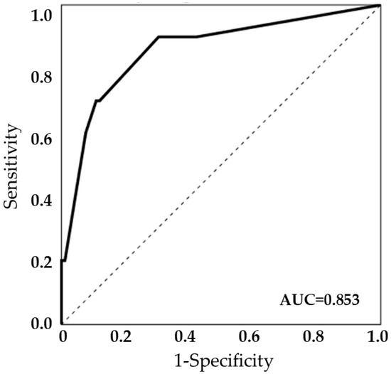 Table 2 presents the variables that are significantly associated with relapse in patients with native joint septic arthritis. According to the univariate analysis, predisposing factors for a poor outcome included the total duration of antibiotic therapy for ≤4 weeks, synovial fluid WBCs, acute kidney injury, and ESBL-producing GNB. However, the initial drainage methods were not associated with relapse. In the multivariate analysis, a total duration of antibiotic therapy for ≤4 weeks (odds ratio (OR), 25.47; 95% confidence interval (CI), 1.57–412.33; p = 0.023) and synovial fluid WBCs ≥150 × 103/mm3 (OR, 17.46; 95% CI, 1.74–175.62; p = 0.015) were identified as independent risk factors associated with relapse. The model’s validity was further assessed using an ROC curve, which yielded an area under the curve of 0.853, indicating the model’s predictive power (Figure 1).