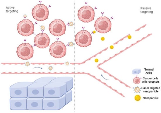 Mechanism of nanoparticle drug delivery via two main mechanisms: active and passive targeting. In active targeting, specific ligands bind to the receptors on the tumor cells, while passive targeting involves nanocarriers that pass through leaky walls and accumulate at the tumor site due to the enhanced EPR effect. Created with BioRender.com, accessed on 20 September 2023.