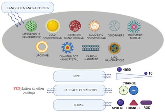 Range of nanoparticles utilized in therapeutic applications. Created with BioRender.com, accessed on 20 September 2023.