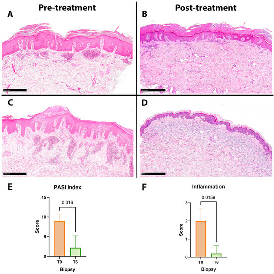 In histology, DMF activity was assessed based on the degree of inflammation using a semiquantitative score ranging from 0/1+ (absent/mild inflammation) to 2+/3+ (moderate/intense inflammation) (Figure 2A–D). The median PASI decreased to 0 after treatment (p = 0.016), as well as the median inflammation score from 2 to 0 in T6 biopsies (p = 0.016) (Figure 2E,F).