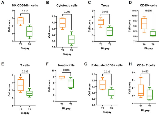 (A–H) Cell score analysis of T0 (n = 5) versus T6 (n = 5) biopsies.