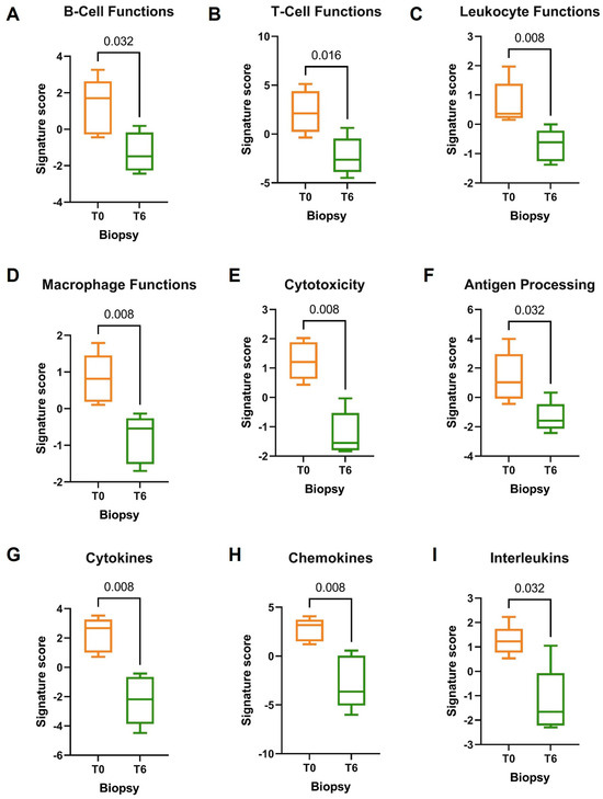 (A–I) Pathway score analysis of T0 (n = 5) versus T6 (n = 5) biopsies.