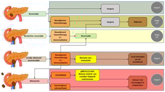 Treatment plans for PDAC should be made following a comprehensive evaluation, including primary staging of the disease and assessment of the patient’s overall health status. At primary staging, PDAC is classified as a resectable disease, borderline resectable disease without metastases, locally advanced disease, or metastatic disease. Accuracy in the primary staging setting is crucial, as disease staging significantly affects treatment decisions. Guidelines for the management of pancreatic cancer have been published by the National Comprehensive Cancer Network (NCCN) in the United States []. Of note, considering the complexity of PDAC, the NCCN also strongly recommends that the management of patients with PDAC should involve high-quality imaging and multidisciplinary discussion at a high-volume center []. The NCCN guidelines pertaining to the resectability of pancreatic cancer, which are based on vascular involvement, are widely accepted and used at multidisciplinary team discussions in the United States [,] (Table 1). Below, the different PDAC resectability groups and the most common treatment options for each group are detailed (see also Figure 1 for a summary).