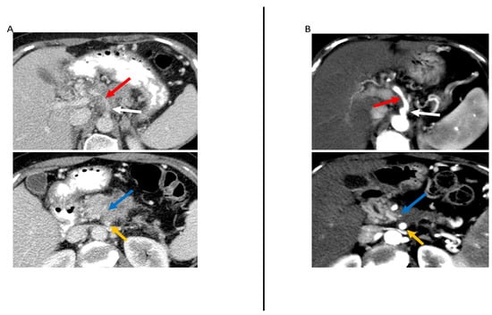 - Kim, Y.E.; Park, M.S.; Hong, H.S.; Kang, C.M.; Choi, J.Y.; Lim, J.S.; Lee, W.J.; Kim, M.J.; Kim, K.W. Effects of neoadjuvant combined chemotherapy and radiation therapy on the CT evaluation of resectability and staging in patients with pancreatic head cancer. Radiology 2009, 250, 758–765. [Google Scholar] [CrossRef]