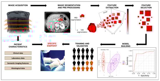 Radiomics enables the quantitative assessment of subtle spatial variations pertaining to pixel intensities and distribution within radiological images; in this way, radiomics has the potential to provide insights into pathologic changes in the tumor and surrounding regions beyond what can be perceived by the naked eye alone [,]. Given this potential, many studies have been conducted in recent years to explore the use of radiomics. Such studies involve a multistep pipeline [,], as described below (also, see Figure 5). Of note, the first two steps are applicable to all research studies involving radiological imaging, i.e., not only those involving radiomics.