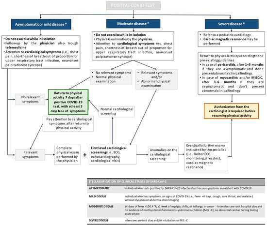 - D’Ascenzi, F.; Castelletti, S.; Adami, P.E.; Cavarretta, E.; Sanz-de la Garza, M.; Maestrini, V.; Biffi, A.; Kantor, P.; Pieles, G.; Verhagen, E.; et al. Cardiac screening prior to return to play after SARS-CoV-2 infection: Focus on the child and adolescent athlete: A Clinical Consensus Statement of the Task Force for Childhood Health of the European Association of Preventive Cardiology. Eur. J. Prev. Cardiol. 2022, 29, 2120–2124. [Google Scholar] [CrossRef] [PubMed]