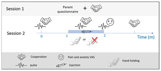 To assess the effect of touch (i.e., handholding), a student or an additional dentist who was not part of the research team attended the second session and collected various measures. The child’s pulse was acquired using a pulse oximeter (Autocorr, BCI 3304, Smith Medical, Minneapolis, MN, USA) before, during, and two minutes after the local anesthetic injection was administered. Cooperation was estimated using the Frankl scale [] before the anesthesia, during the anesthesia, and at the end of the treatment. Finally, immediately after receiving the anesthesia, the children were asked to evaluate their pain and anxiety from the treatment using a Visual Analogue Scale (VAS) and Visual Analogue Scale for Anxiety (VASA), respectively. The VAS/VASA presents the children with a scale accompanied by appropriate facial expressions. On one end, the facial expression reflects ‘no anxiety’/‘no pain’, and on the other, ‘high anxiety’/‘high pain’ [,].