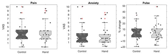 Pain and anxiety with and without hand-holding. The plots show boxplots of the control group (in dark grey) and the test group whose hand was held during the injection (light grey). On each box, the central mark indicates the median, and the bottom and top edges of the box indicate the 25th and 75th percentiles, respectively. The whiskers extend to the most extreme data points that were not considered outliers, and the outliers are plotted individually using the ‘+’ marker symbol. The differences are displayed for the VAS of pain (left), anxiety (middle), and the relative change in pulse during the injection (right). No statistically significant differences were found.