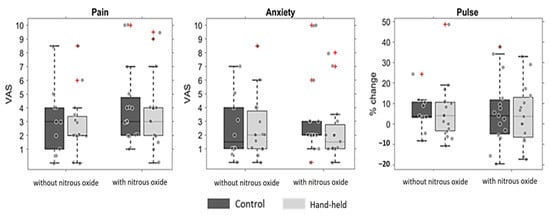 Pain and anxiety levels as reported with and without hand-holding, presented and sorted by nitrous oxide administration. The boxplots show the control group (in dark grey) and the test group whose hand was held during the injection (light grey), separated according to nitrous oxide administration. The whiskers extend to the most extreme data points that were not considered outliers, and the outliers are plotted individually using the ‘+’ marker symbol. The differences are displayed for the VAS of pain (left), anxiety (middle), and the relative change in pulse during the injection (right). No statistically significant differences were found.