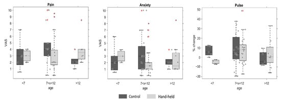 Pain and anxiety with and without hand-holding of the children under dental treatment, classified by age-group. The plots show boxplots of the control group (in dark grey) and the test group whose hand was held during the injection (light grey), separated according to age group. The whiskers extend to the most extreme data points that were not considered outliers, and the outliers are plotted individually using the ‘+’ marker symbol. The differences are displayed for the VAS of pain (left), anxiety (middle), and the relative change in pulse during the injection (right). No statistically significant differences were found.