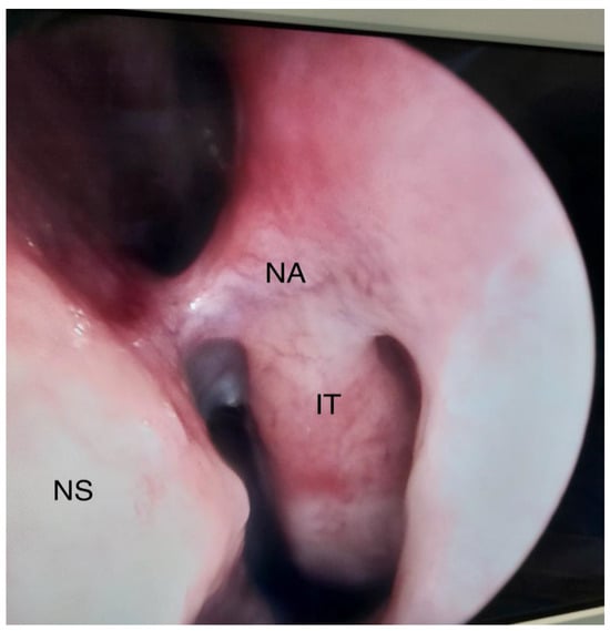 Adhesion between the nasal septum and the inferior turbinate, left side. NS—Nasal septum, IT—inferior turbinate, NA—nasal adhesion.