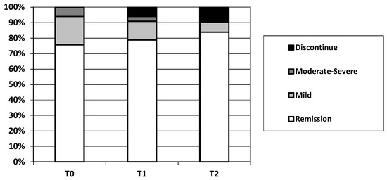 Regarding the GP2017 efficacy, at the time of starting the therapy (T0), 5/29 patients (17.2%) were in clinical remission, 16/29 patients (55.1%) had mild disease activity, and 8/29 patients (27.6%) had moderate-to-severe activity. After 6 months (T1), 10/29 (34.5%) were in remission, 17/29 (58.6%) had mild activity and 8/29 patients (27.6%) had moderate-to-severe activity. After 12 months (T2), 17/29 (58.6%) were in remission, 9/29 (31.0%) had mild activity, and 1/29 patients (3.5%) had moderate-to-severe activity (Figure 1).