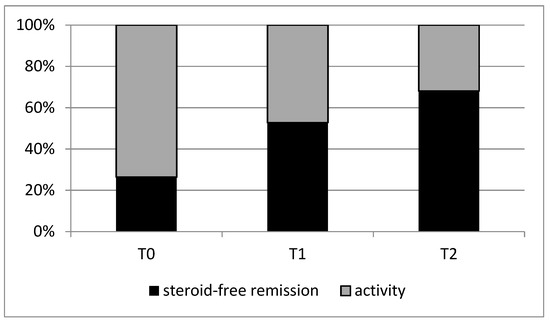 As shown in Figure 4, the overall steroid-free remission was present in 19 patients at T0 (26.4%), in 38 patients (52.8) at T1 (p < 0.001), and in 49 (68.1%) at T2 (p < 0.001).